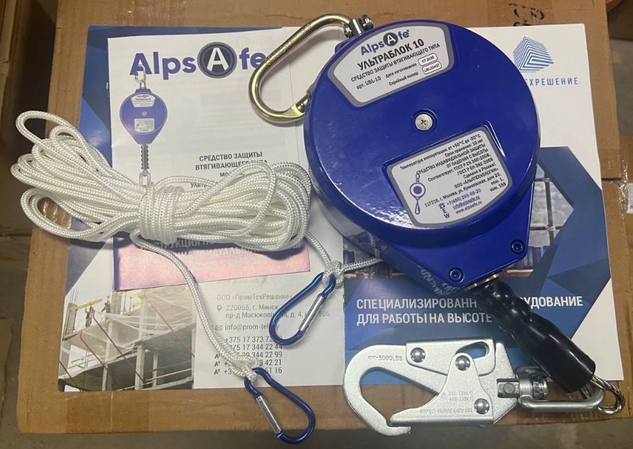 УЛЬТРАБЛОК 10 — это профессиональное средство защиты втягивающего типа, предназначенное для обеспечения безопасности работников на высоте. Устройство используется для предотвращения падения с высоты и минимизации рисков травматизма. Оно оснащено автоматическим втягивающим механизмом, который позволяет свободно перемещаться в пределах рабочей зоны, но при этом блокируется в случае резкого рывка, вызванного падением.